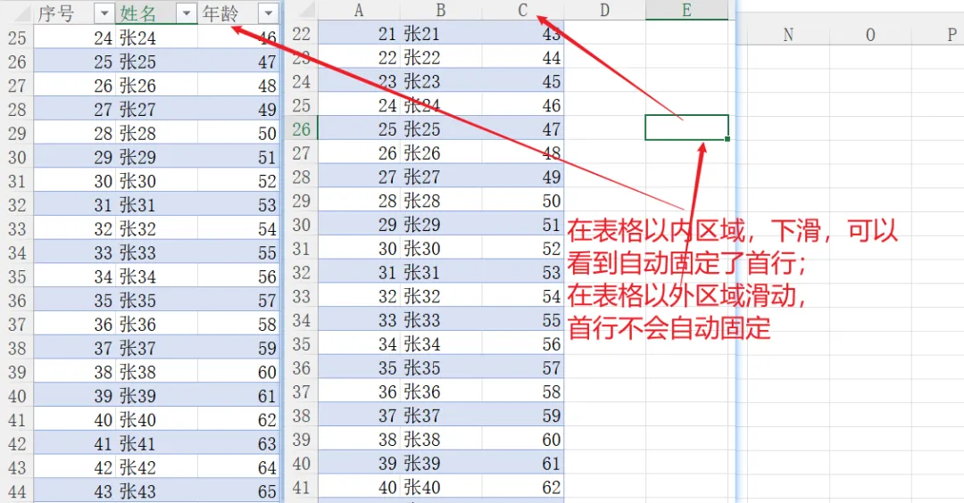 在表格以内区域,下滑,可以看到自动固定了首行;在表格以外区域滑动,首行不会自动固定。