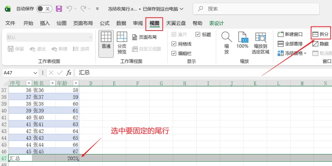 冻结尾行步骤:选中要冻结的尾行,依次点击「视图→拆分」。