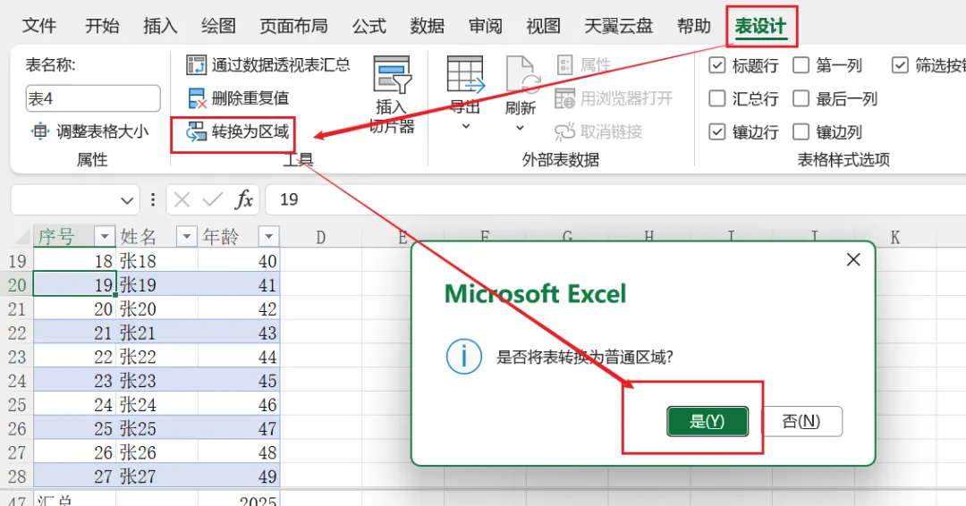 依次点击「表设计→转换为区域→确定」,即可将超级表转换为普通表格。
