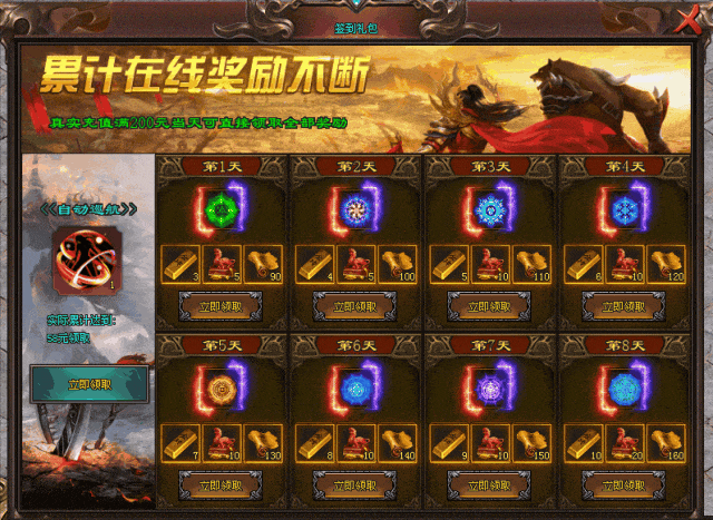 进游戏领取签到礼包,获得不同等级魂环装备,魂环可增加怪物爆率,鞭尸几率,等级越高,属性越高,佩戴此装备打怪时还能额外增加元宝跟钻石的收入,魂环等级越高概率获得元宝钻石越多,