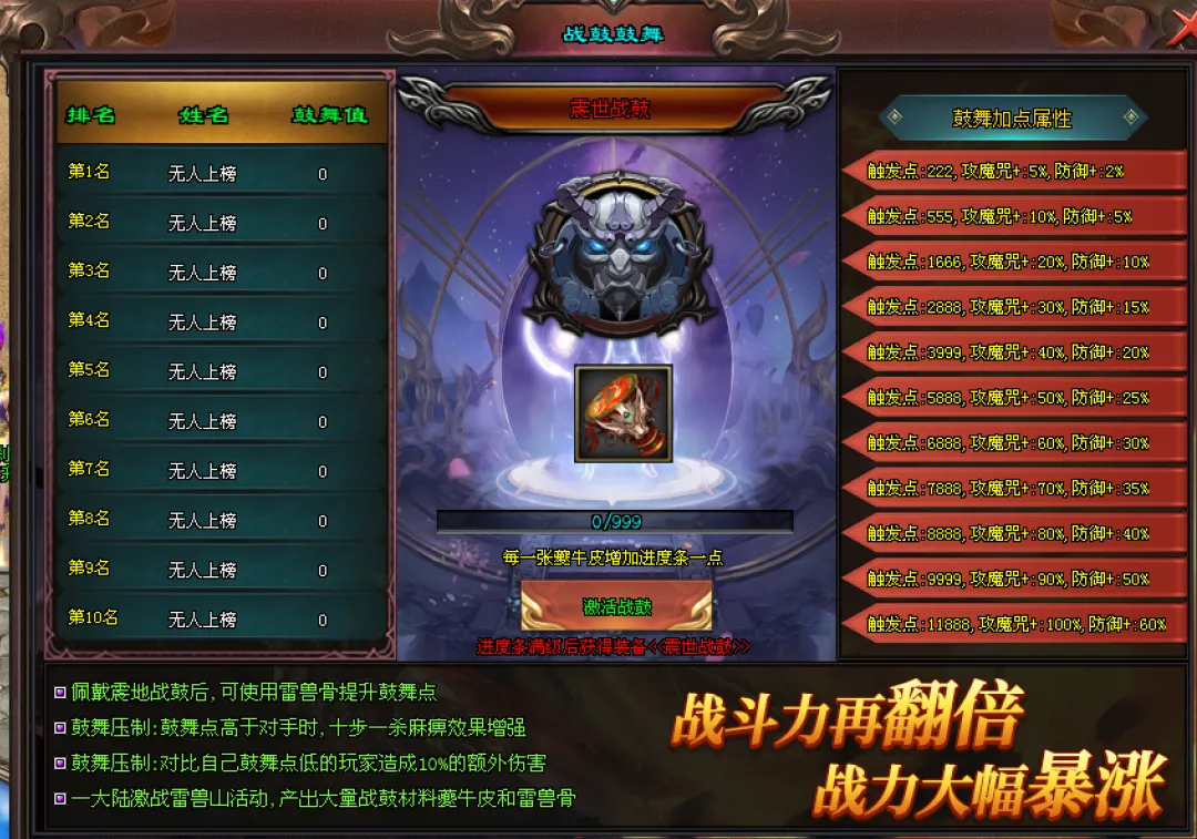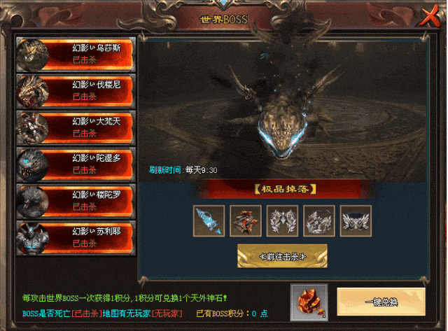 参与世界BOSS活动,每击杀BOSS一次就获得1积分,积分可在世界BOSS界面中兑换天外神石材料,用来升级专属法宝,并且击杀BOSS还可掉落高等级装备,积攒一定材料后就可进行法宝升级法宝可以增加防御,生命倍数以及暴击伤害,既可以防御还能攻击对方的必备装备!