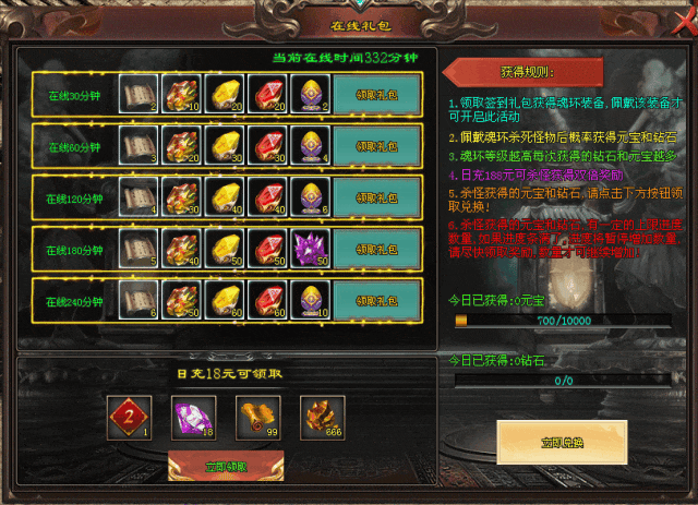 注意:当钻石跟元宝进度条满后将不再增加数量,一定要尽快领取奖励,进度条才可继续增加货币数量!!!