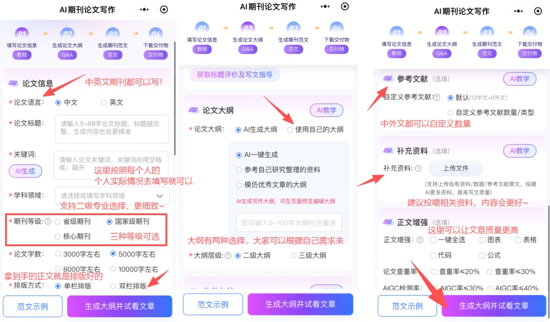 (2)大纲支持免费生成,并且可以参考自有大纲以及开题报告等内容,更贴合咱们的需求。