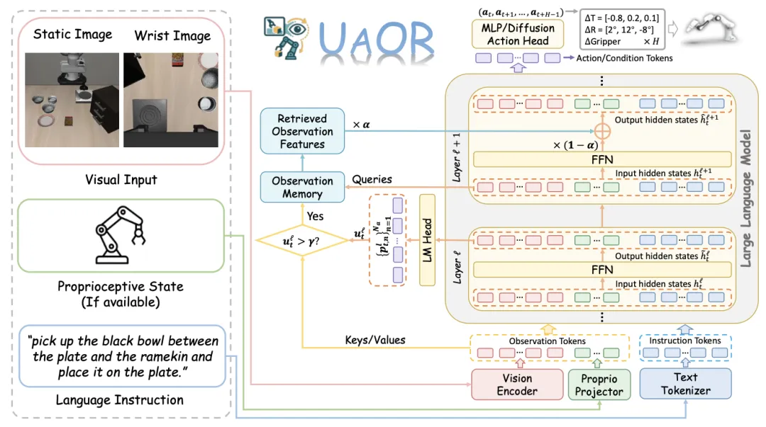 ✨ 首次揭示VLA模型在推理过程中存在“观测信息遗忘”现象,并提出无需训练、即插即用的UAOR模块,通过不确定性触发将观测特征重新注入FFN层,提升模型性能