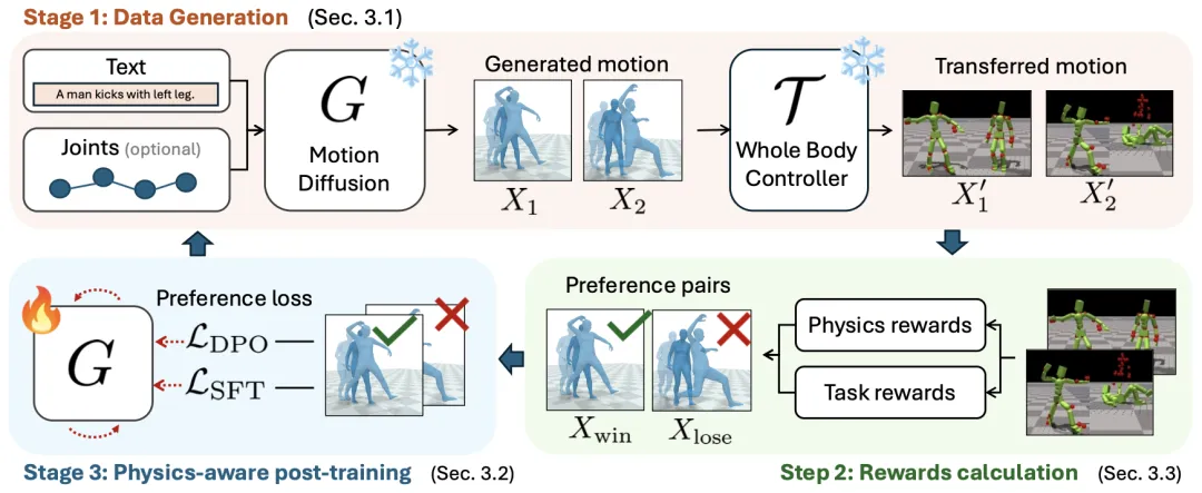 ✨ 将物理仿真控制器引入扩散模型的微调环路,通过直接偏好优化,使生成的运动在遵循指令的同时,经得起物理引擎的推敲