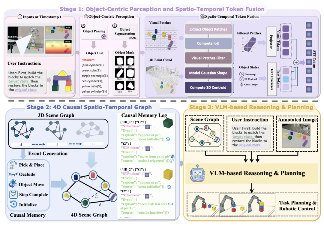 📖 基于VLM的规划器将每一步视为孤立的观察到动作的映射,缺乏对先前动作如何改变环境的感知,导致长视野任务中感知误差累积和前提条件违例。受人类持续心理模型的启发,本文提出RoboStream,一个无需训练的框架。它通过时空融合令牌将视觉证据与3D几何属性绑定,实现持久化的物体锚定;并通过因果时空图记录由动作触发的状态转换,维护因果连续性。这种设计使规划器能够追踪因果链并在遮挡下保持物体存在感。RoboStream在长视野RLBench和真实世界积木搭建任务中分别取得90.5%和44.4%的成功率,远超现有方法。