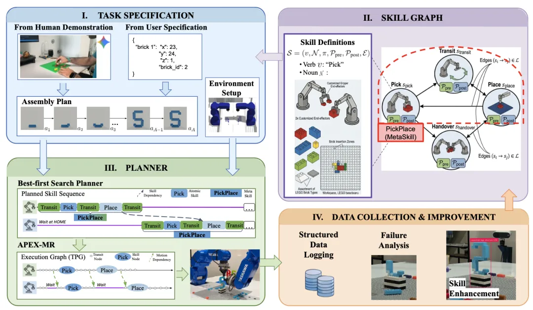 ✨ 提出技能图这一统一抽象表示,将装配任务的语义描述、可执行策略、条件验证和性能评估融为一体,实现系统的快速集成与闭环优化