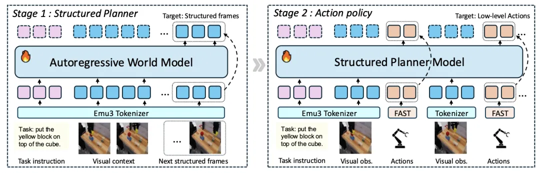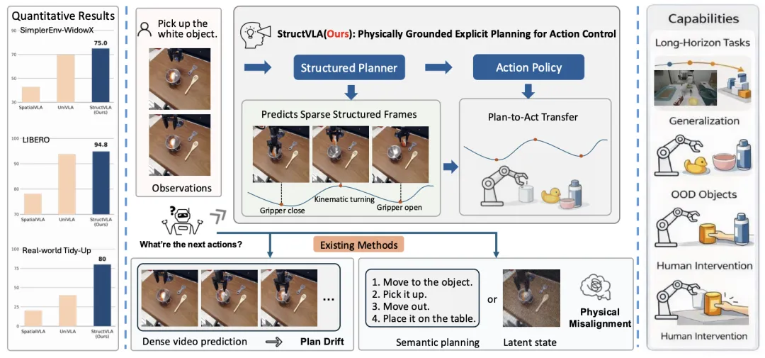 📖 现有的基于世界模型的视觉-语言-动作(VLA)架构通过预测性的视觉前瞻改善了机器人操作。然而,密集的未来预测引入了视觉冗余并累积误差,导致长视野规划漂移。本文提出StructVLA,该框架将生成式世界模型重构为一个显式的结构化规划器,用于可靠控制。StructVLA不是预测密集的未来图像,而是预测稀疏的、物理上有意义的结构化帧,这些帧源自内在的运动学线索(如夹爪状态转换和运动转向点)。通过两阶段训练(先预测结构化帧,再生成低层动作),StructVLA在SimplerEnv和LIBERO基准测试中分别取得了75.0%和94.8%的平均成功率,并在真实世界的长视野任务中表现出强大的泛化性和鲁棒性。