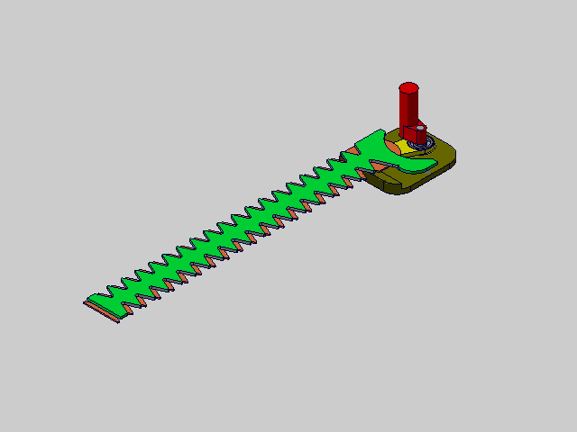 该机构用于驱动灌木修剪器的双面刀刃,使其进行往复或旋转运动以修剪枝叶。其设计可能包含使两片刀刃相对运动的连杆或齿轮机构,以提高修剪效率和整齐度。需要具备足够的动力和良好的平衡性,以应对修剪不同硬度灌木时的负载。