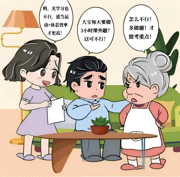 漫画里的哥哥大宝就是“陀螺小孩”,明明只是小学生,每天却要做3小时的课外题,睡眠不足严重影响了他的精神状态。奶奶对此视而不见,认为“只有多做题,才能考上重点学校”,爸爸妈妈则不这样想,认为要保障孩子运动和休息时间,劳选结合才能提高学习效率。健康作息后,哥哥成绩不降反升,奶奶也转变了想法。