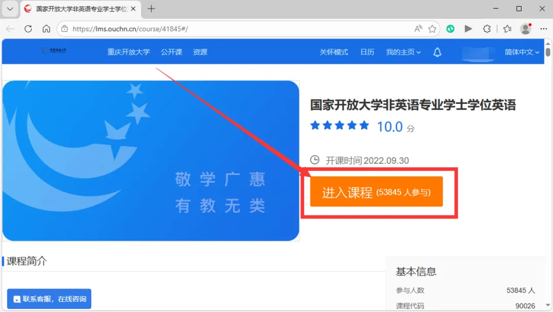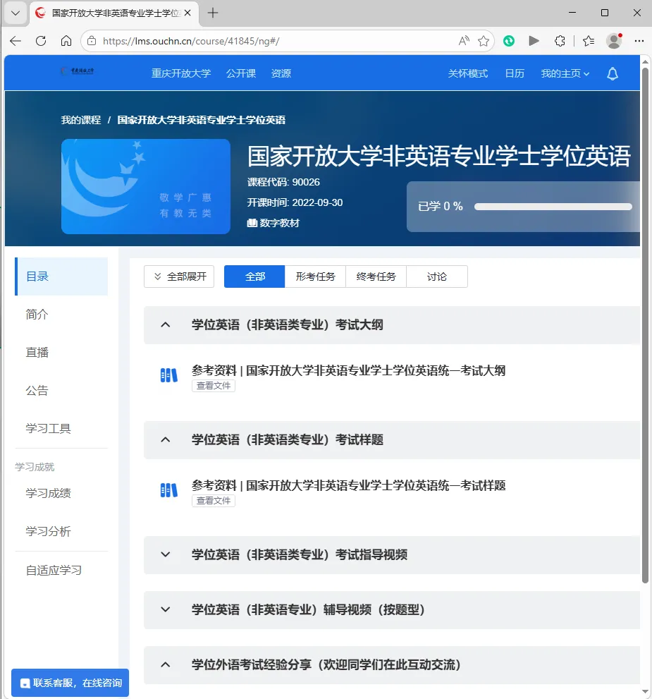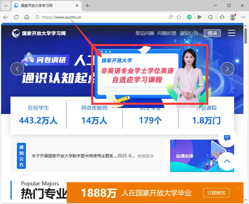 非英语专业学士学位英语学习资源 一、访问国家开放大学学习网https://www.ouchn.cn/,点击主页漂浮图标“非英语专业学士学位英语自适应学习课程”。 二、使用国家开放大学学习网学生账号和密码登录。 三、登录成功后,点击“进入课程”。 四、点击对应学习资源进行学习。 祝同学们学位英语考试成功!