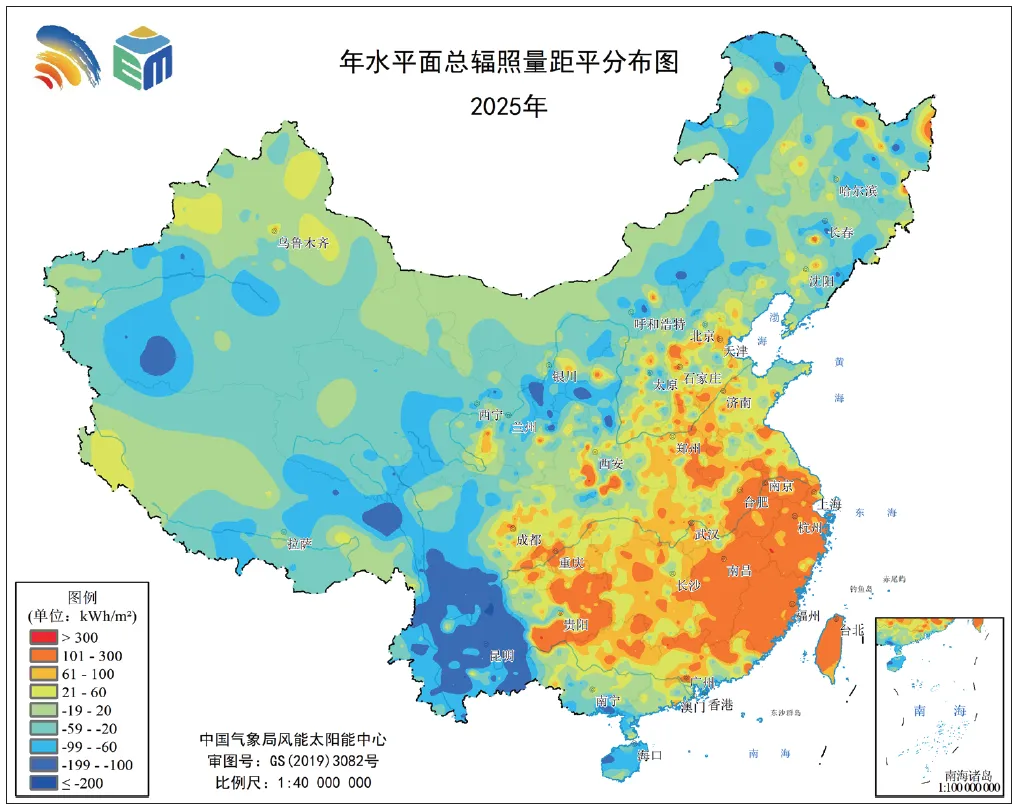 2025年全国陆地年水平面总辐照量距平分布(单位:kWh/m²)