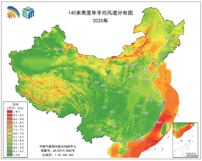 2025年全国陆地及部分海上区域140米高度年平均风速分布(单位:m/s)