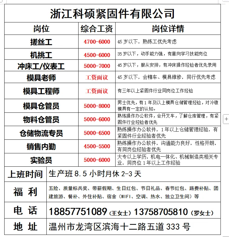 【浙江超伟机械有限公司】一、人力资源经理/招聘专员1名二、机械设计师/制图员2名三、制程工程师/工艺工程师2名四、仓库管理员3名五、采购员1名六、电气制图员1名七、新媒体运营1名八、剪辑/美工1名 九、外贸业务员1名十、PMC(生产计划/物控/调度)5名十一、财务助理1名待遇:5000-15000元/月,8小时,餐补200元/月,全勤100元/月,有社保,公司提供宿舍。联系电话:15356776722(微信同号) 地址:瑞安市南滨街道阁巷新区远航路518号