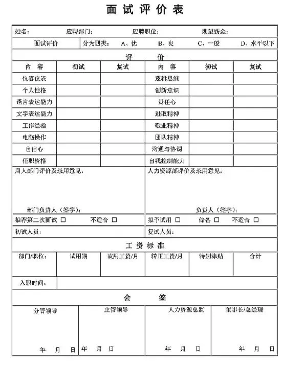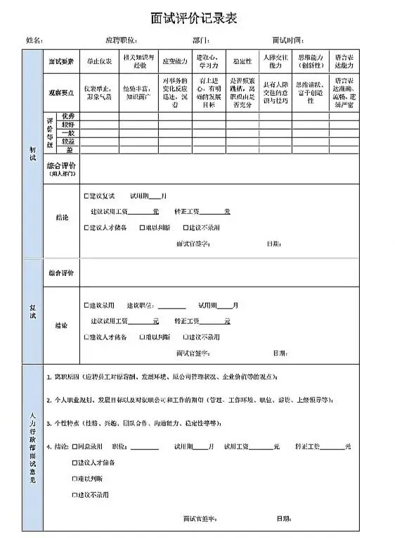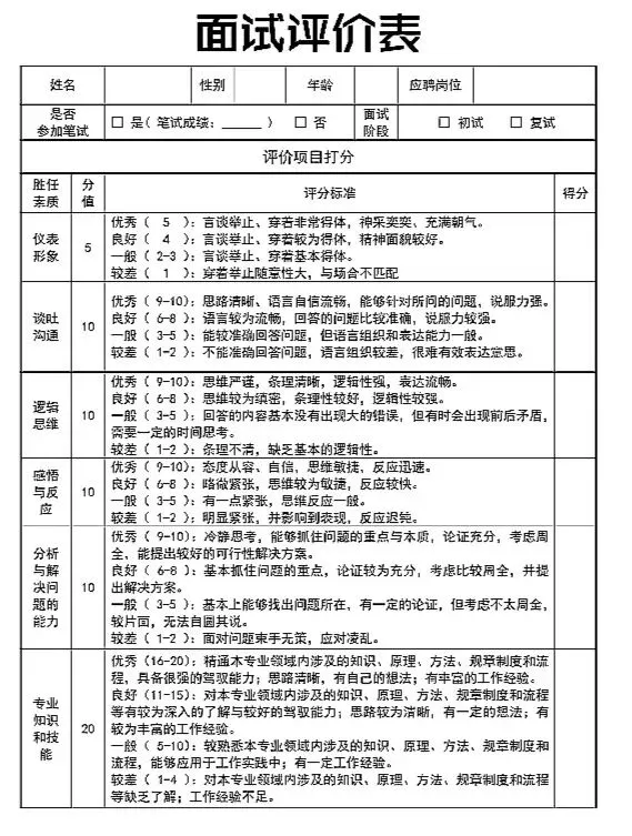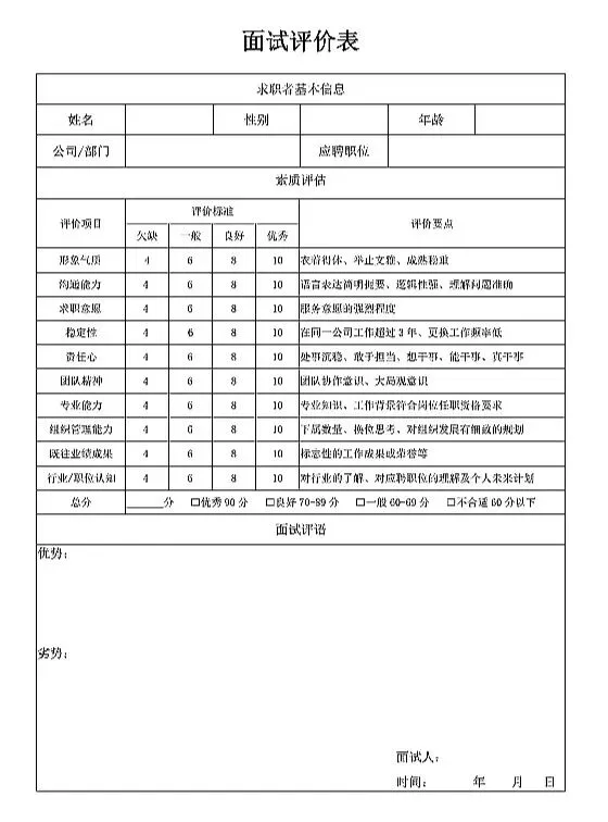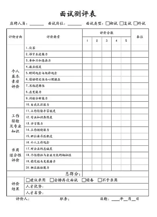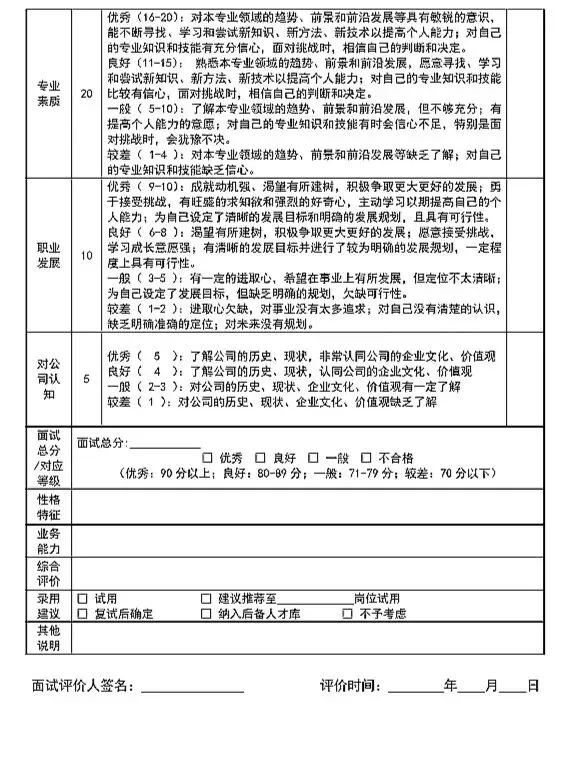 本文内容分享【面试评价表模板】(文末可免费领取word电子版)