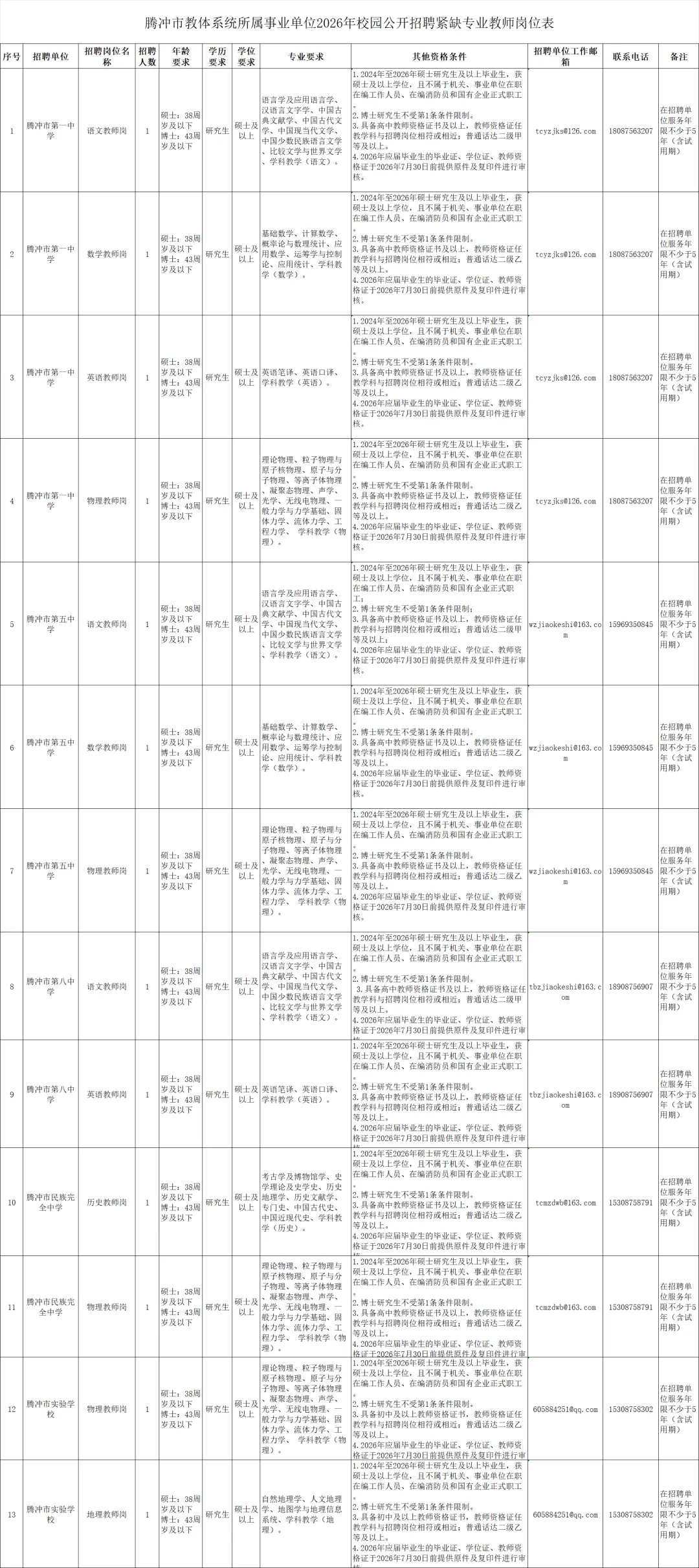 各招聘单位咨询电话详见《腾冲市教体系统所属事业单位2026年校园公开招聘紧缺专业教师岗位表》(附件1)