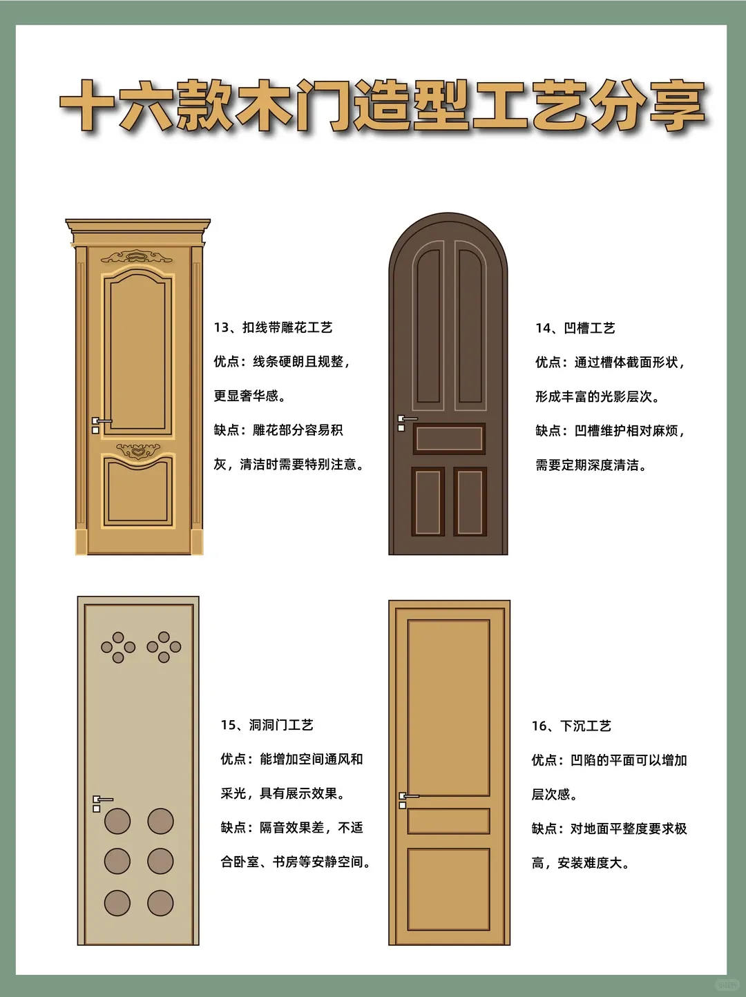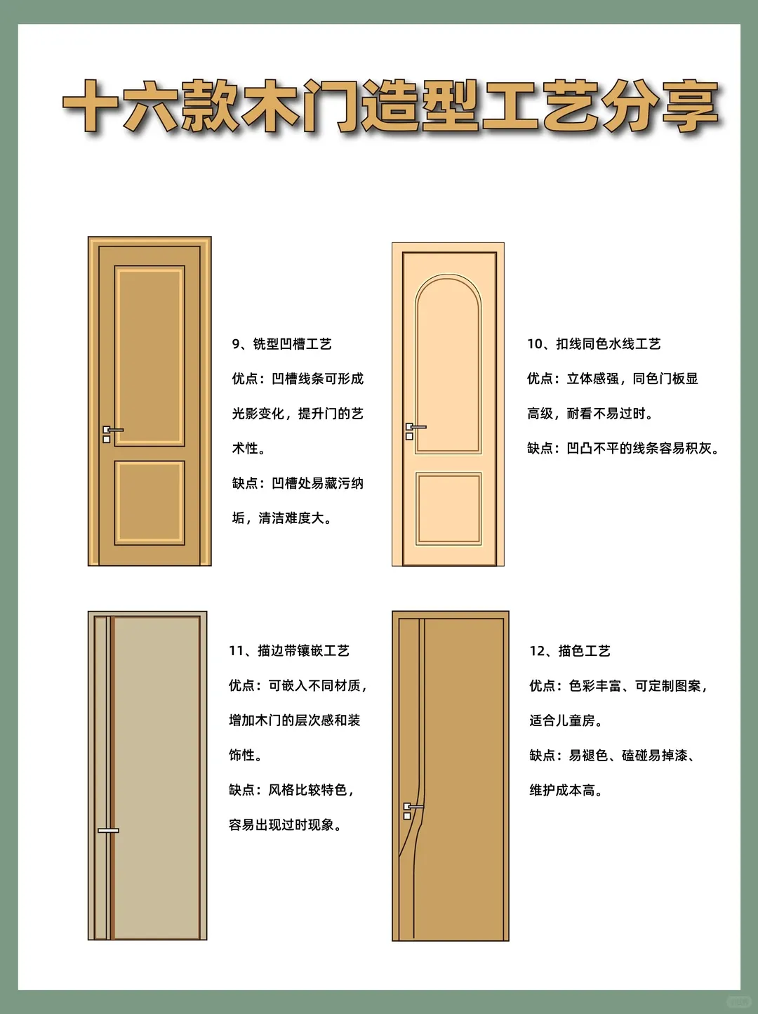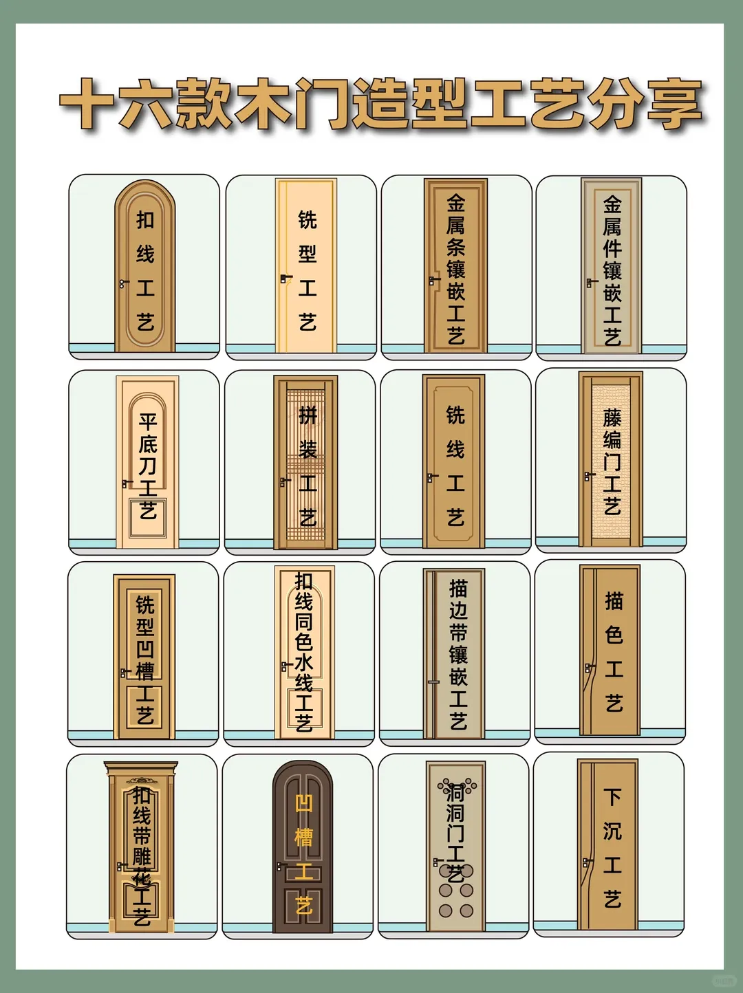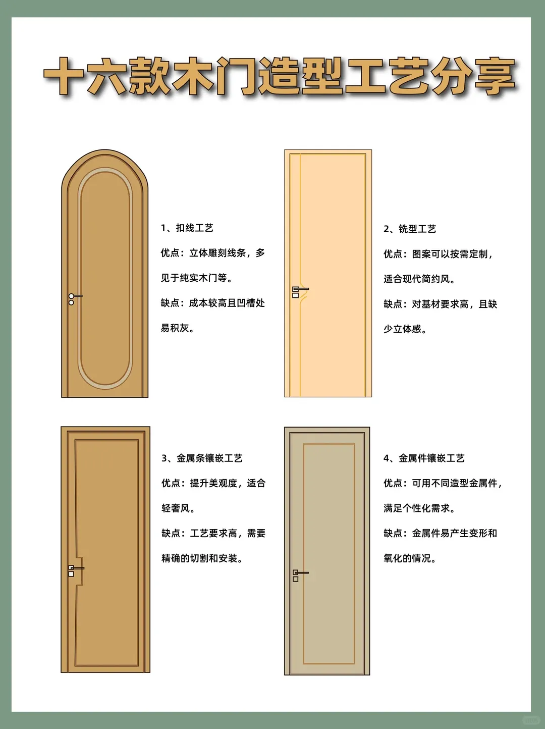 例如 扣线工艺 :立体雕刻线条,多见于纯实木门等;但成本较高且凹槽处易积灰 铣型工艺:图案可以按需定制,适合现代简约风;对基材要求高,且缺少立体感 而金属条镶嵌工艺:提升美观度,适合轻奢风;但工艺要求高,需要精确的切割和安装等等 . 看完后不纠结不踩坑,还能提升自身专业度 自己去选门或者跟设计师沟通再也不用怕别人把你当小白啦!
