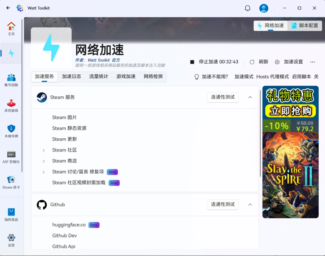 访问GitHub慢、Steam商店打不开?瓦特加速器(Watt Toolkit,原名Steam++)是一款开源免费的网络加速工具,它通过本地反向代理技术,帮你流畅访问Steam社区、GitHub、Discord等网站,还支持游戏账号切换、脚本管理,是开发者和游戏玩家的必备神器。