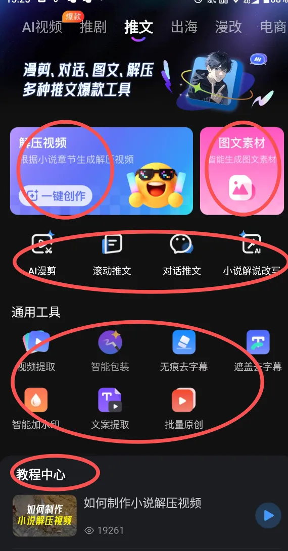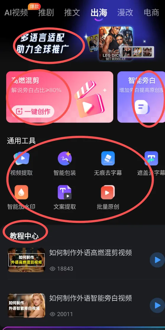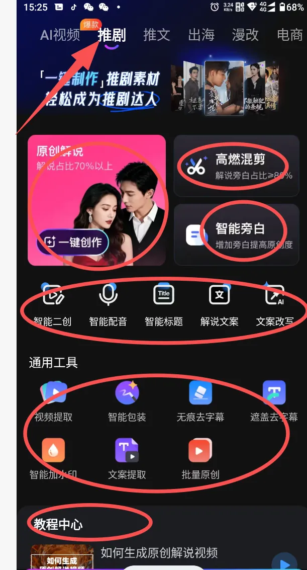 下面展示的是咱们的短剧板块,混剪+帮白+原创解说+通用工具+教程中心