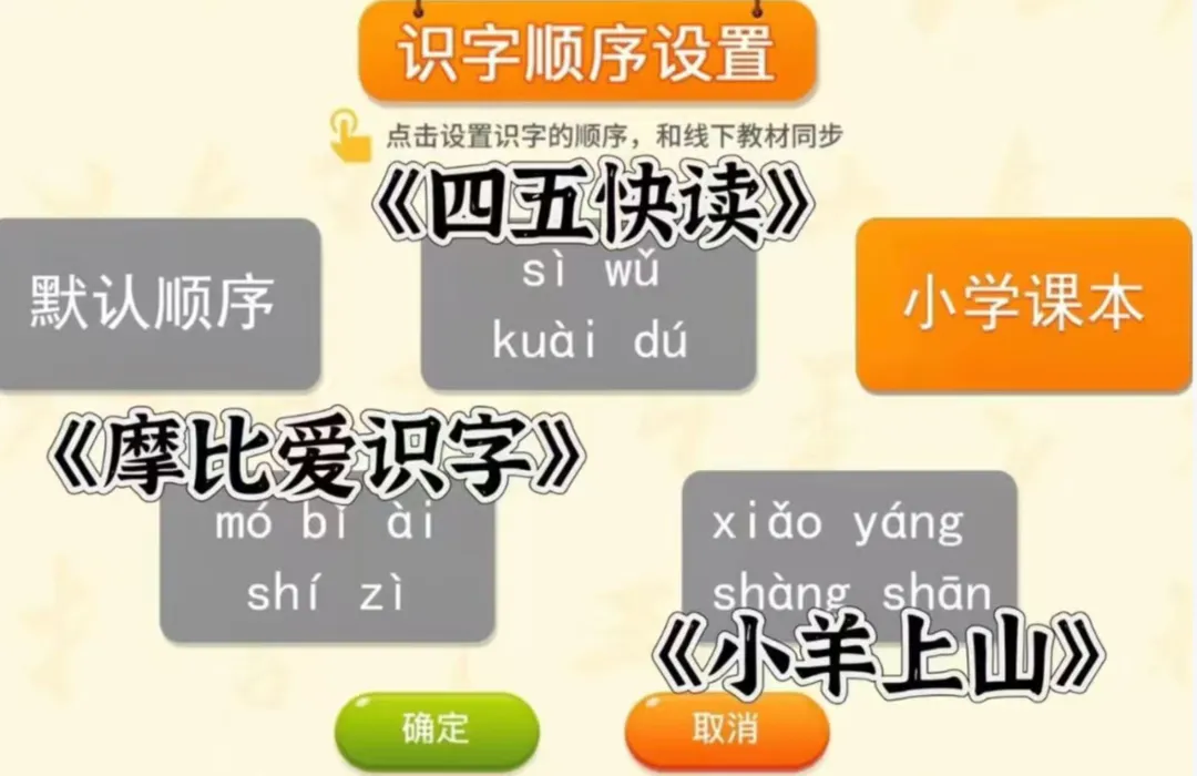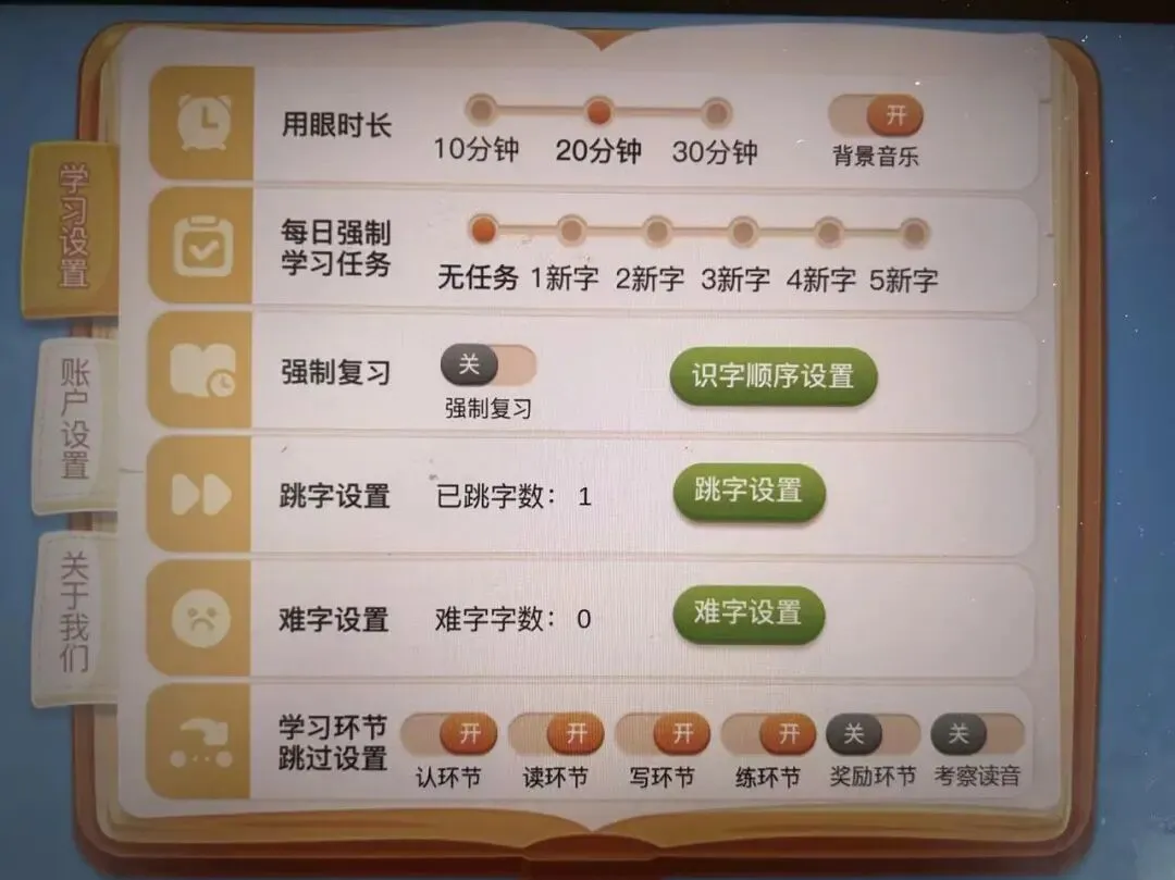 识字顺序可以自己设置,结合线下的教材,手头上不同的教材可以切换不同的识字顺序,比如四五快读,人教版语文,摩比爱识字,可以自由切换。还有一些其他的学习设置,如跳字、强制复习、学习环节设置等,方便个性化定制。