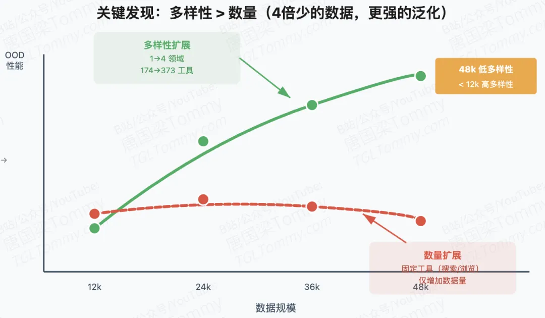 发现一:多样性扩展碾压数量扩展。在对照实验中,12k 高多样性数据(工具池从 1 个领域扩展到 4 个)在所有 OOD 基准上都超越了 48k 低多样性数据(固定搜索/浏览工具,只增加数据量)。这表明当目标是泛化时,数据的覆盖广度比重复次数更重要。