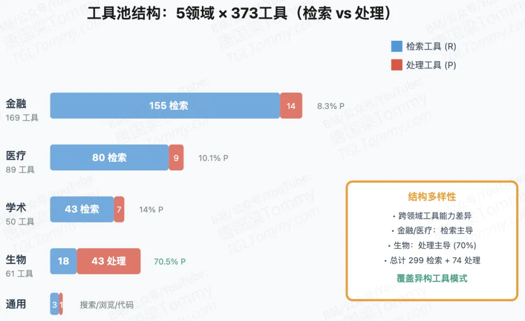 工具池覆盖:从 5 个领域(通用、金融、医疗、学术、生物)采集 373 个真实 API,包含检索类工具(如 ncbi_search)和处理类工具(如 seq_translate)。这些工具经过单元测试、并发安全和响应一致性验证,确保训练稳定性。