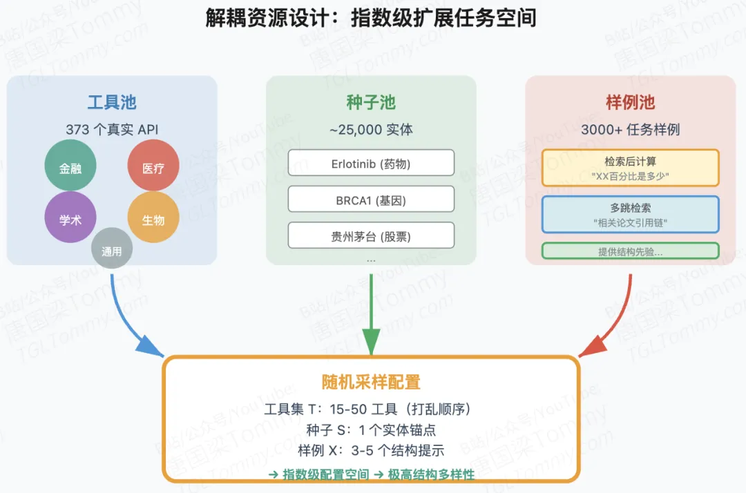此外,种子池(从 Wikipedia、PubMed 等挖掘的 ~5000 个实体)避免了话题坍缩,样例池(来自异构任务家族的查询)提供了隐式的工具使用模式(如”检索后计算””多跳检索”)。这三个资源池解耦设计,可以独立采样并组合,指数级扩展了任务空间。