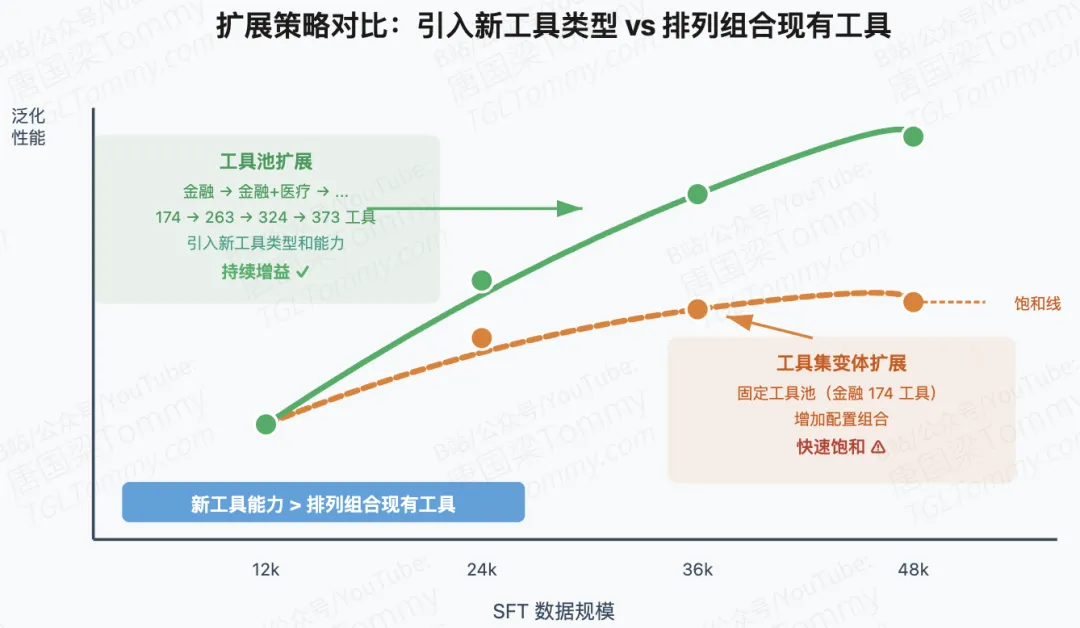 发现二:工具池扩展比工具集变体更有效。两种扩展策略的对比显示,仅在固定工具池内增加工具集组合(Toolset-variety-only)收益有限且快速饱和;而同时扩展工具池到新领域(Pool-Expansion+Variety)能获得更快的增益和更高的天花板。这提示引入新工具能力比排列组合现有工具更能提升泛化。