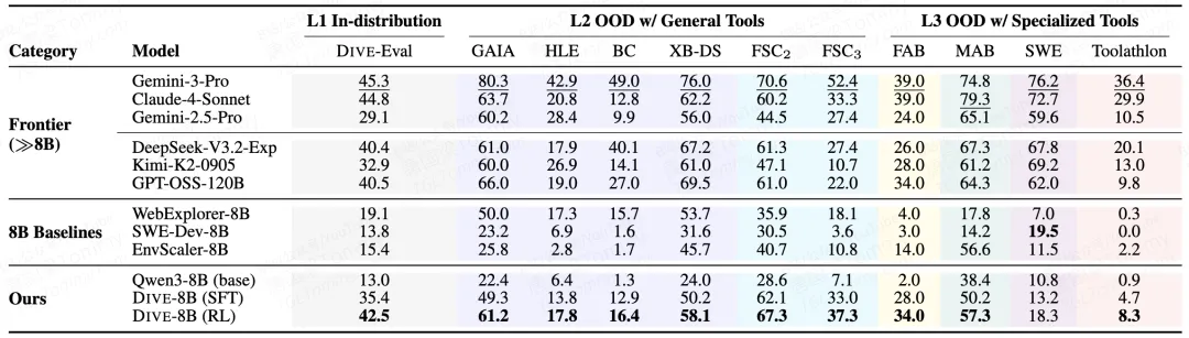 这篇来自复旦和 MiniMax 的论文聚焦一个具体场景:如何让 LLM 在面对新任务、新工具集时仍能可靠地完成复杂的多步工具调用。他们的方案 DIVE 在 Qwen3-8B 上训练后,在 9 个 OOD 基准上平均提升 22 个点,超越最强 8B 基线 68%,甚至在某些任务上逼近百亿级参数的前沿模型。