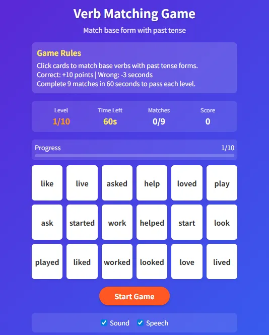 对标Oxford Phonics 2级和3级的内容,让孩子们区分5个元音字母的短音和长音,在游戏中巩固“辅元辅”结构和“辅元辅e”结构,以及常见的元音组合。2. 过去式对对碰https://dkfile.istester.com/Daisy_Xiaoliba/VerbMatchingGame-FinalVersionwithEnhancedCelebration1.html