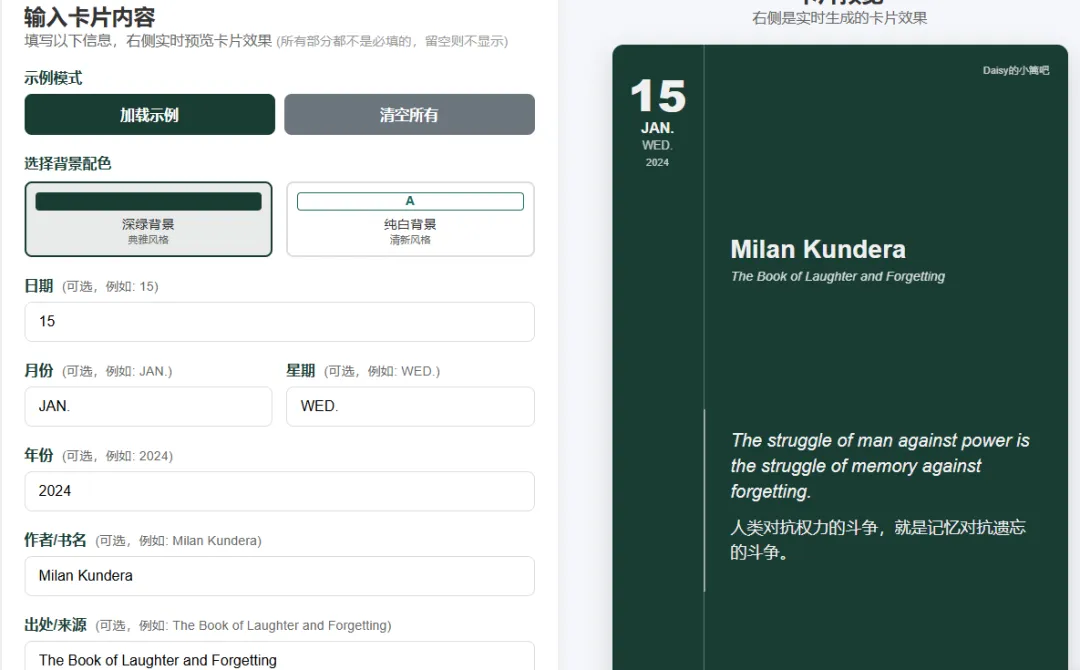这个小工具其实主要是为自己做的,因为我平时读到喜欢的句子会想记录下来分享给大家。我设计的这个工具可以写中英互译版,也可以只写其中的一种,篇幅太大的话还可以把字体调小。AI的出现让我这个文科生也过了把编程瘾。设计这些小工具其实很耗时,要一遍遍跟元宝沟通,有些东西它实在做不出来就只能妥协了。如果你一下子给的指令太多,它也做不过来,会显示对话已到达了上限,也算是体验了一把甲方的无奈了。