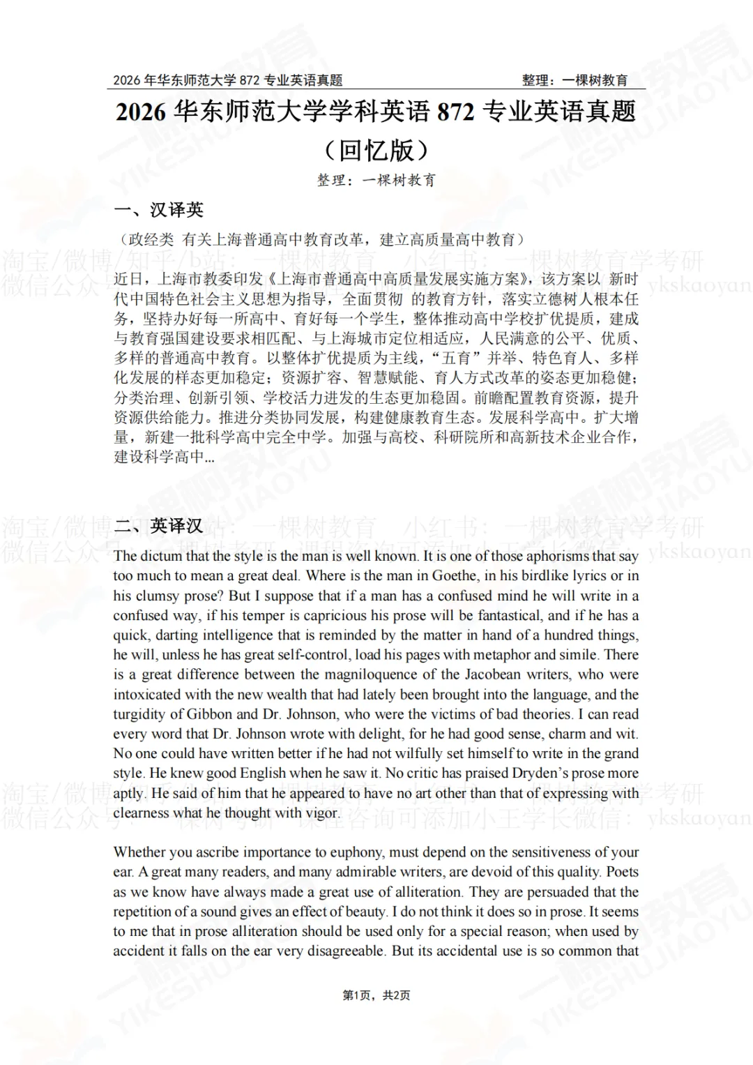 华东师范大学学科英语872专业英语真题合集(25-26)