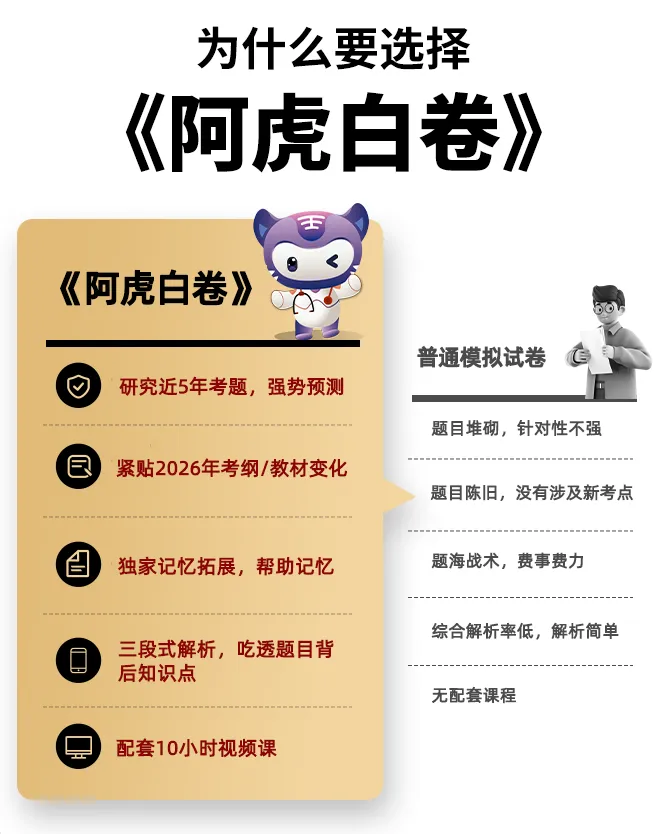 《阿虎白卷》(电子版)是阿虎医考的王牌预测试卷,资深教研深入研究近5年考题,统计常考点、重难考点,紧扣最新考纲/教材,强势预测,学员好评无数。
