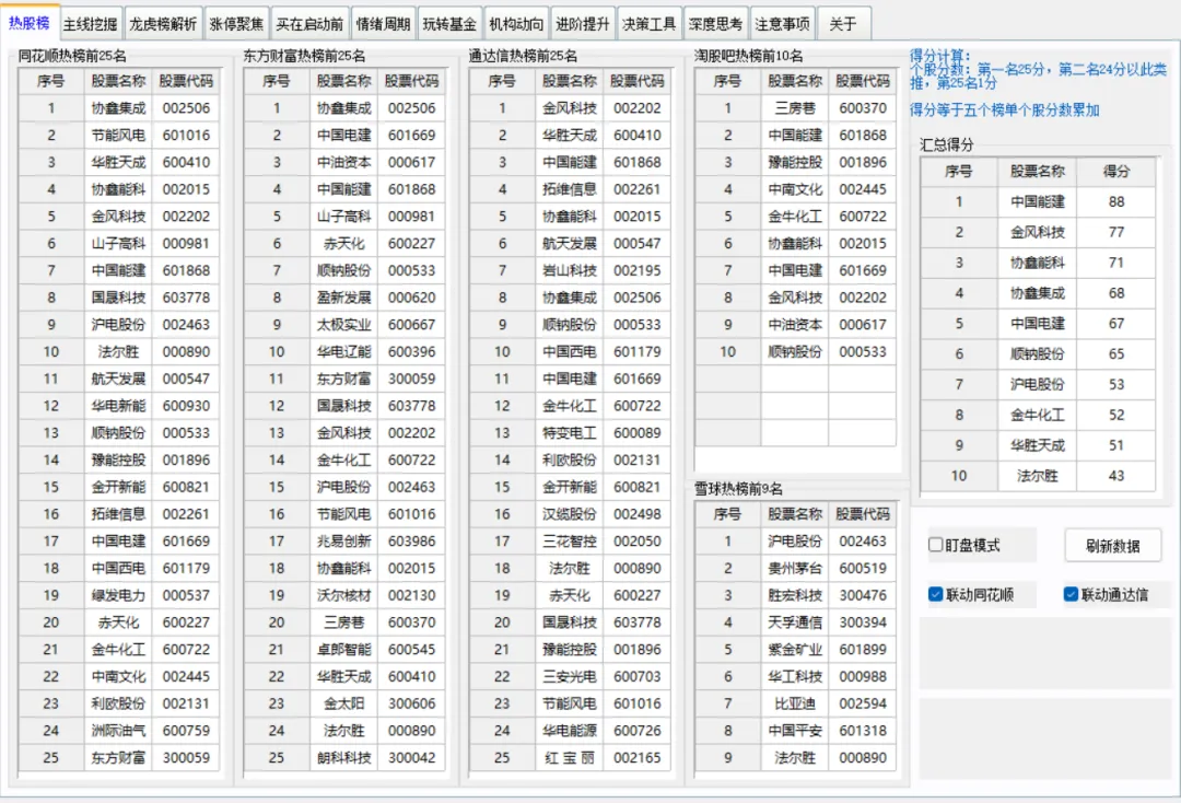 不用再翻同花顺、东方财富、雪球来回对比了!这款直接整合 5 大平台热门股,按 “第 1 名 25 分、第 2 名 24 分… 第 25 名 1 分” 加权打分,汇总分实时更新,分数越高越靠谱,热门潜力股直接排好队等你挑!