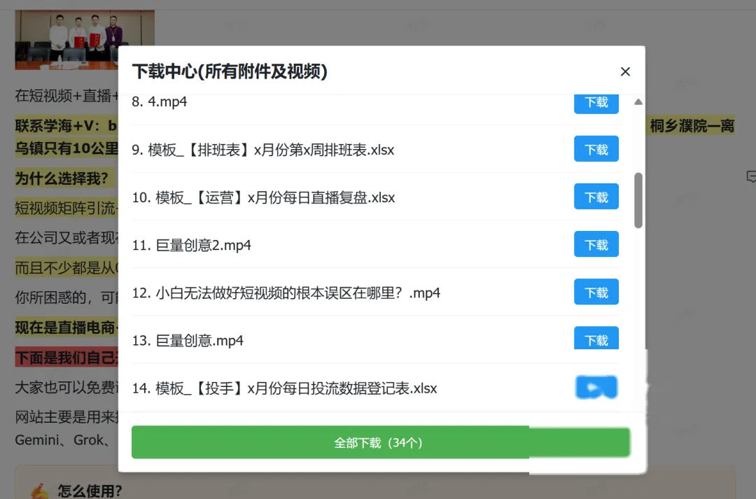 打开目标文档页面,点击插件面板里的”下载文件“按钮。页面会弹出一个窗口,把文档里所有的附件和视频全部列出来。
