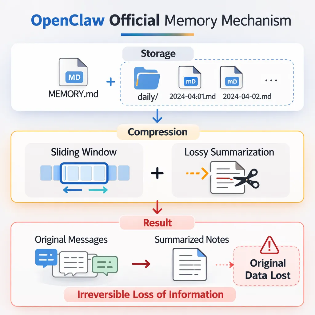 OpenClaw原生是”有损压缩 + 文件记忆”双保险,但压缩是硬伤,记忆是靠手动。