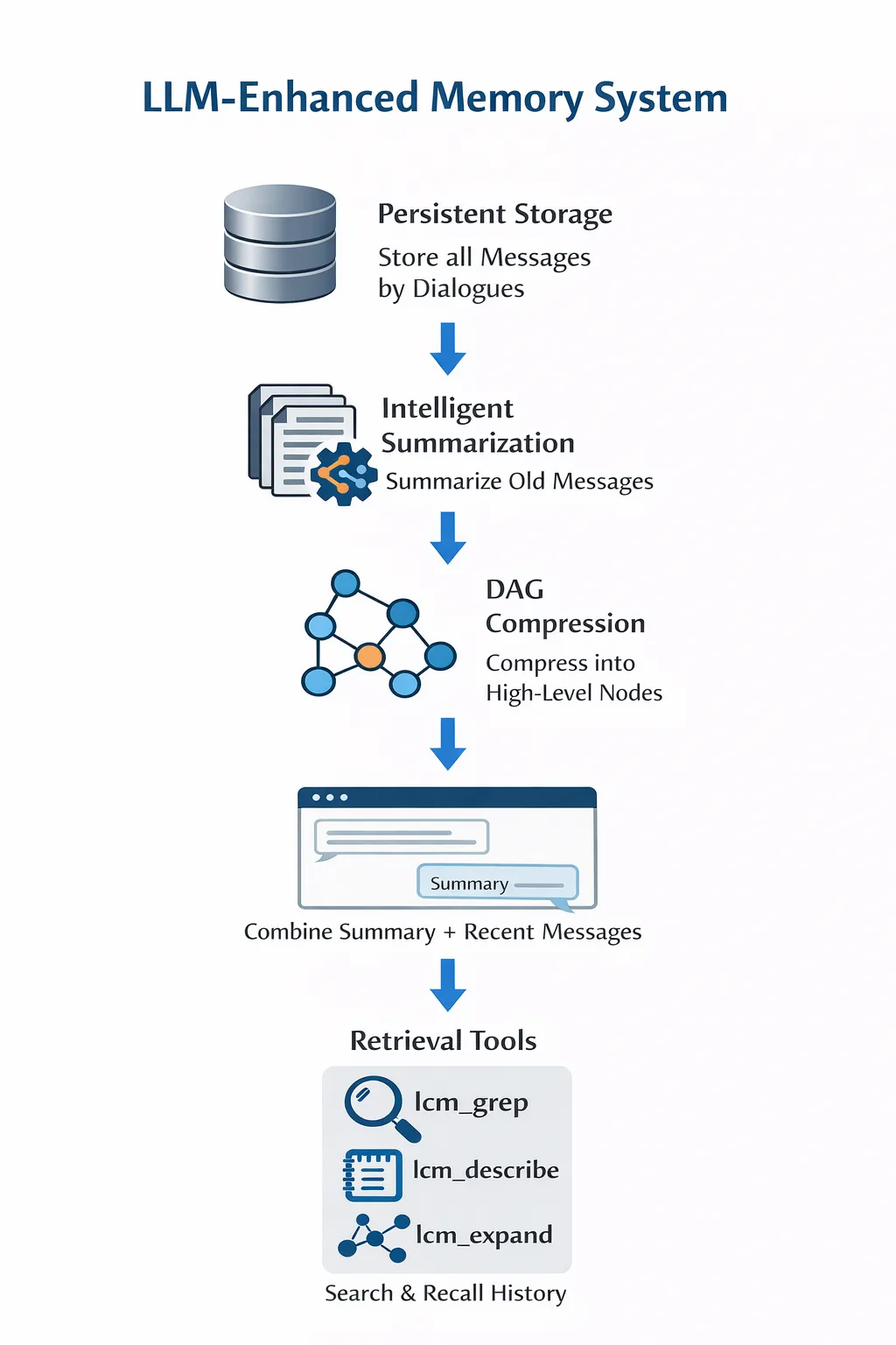 5. 检索工具 – 最后,系统提供 lcm_grep、lcm_describe、lcm_expand等检索工具,让 Agent 可以搜索和召回压缩历史,从而实现对压缩记忆的高效召回。