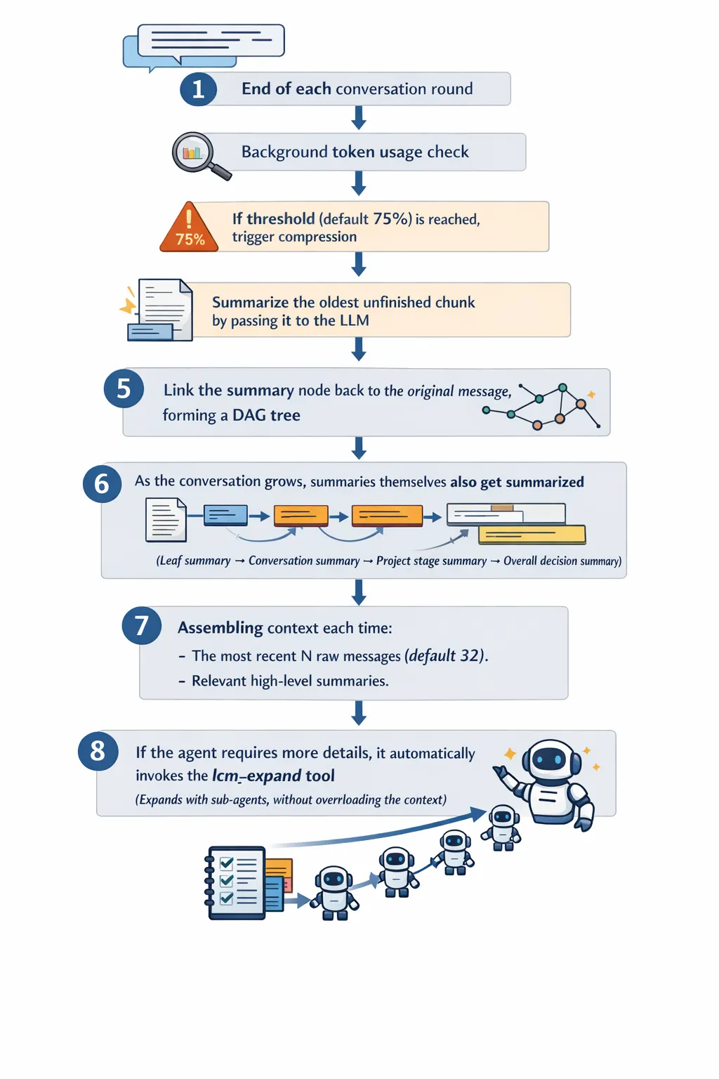 8. Agent 需要细节时,自动调用 lcm_expand 工具