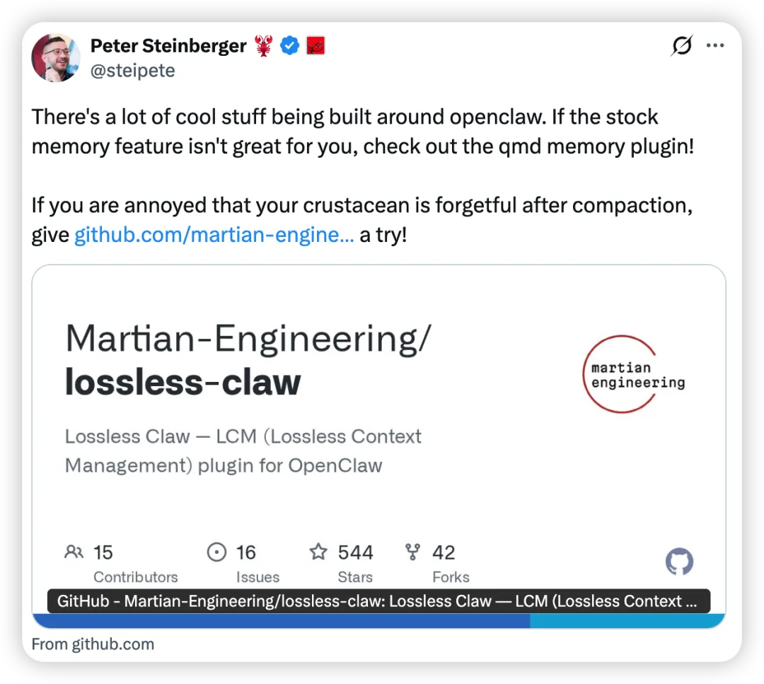 lossless-claw = 给 AI Agent 一个真正的长期记忆系统。不再失忆,不再重复,不再丢失上下文。