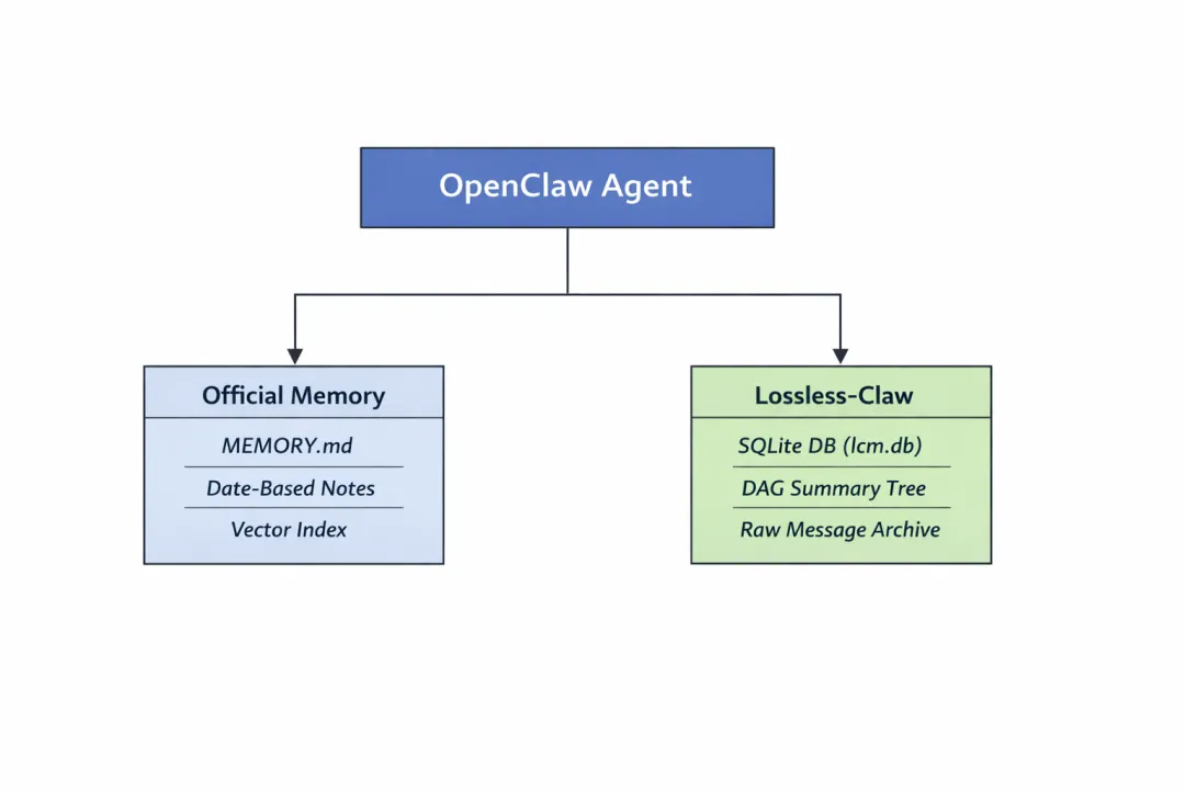 如果觉得前两章 OpenClaw 原生记忆存储机制和 Lossless-Claw 插件记忆存储机制的解析太啰嗦,我们可以看下面的快速对比表,了解它们之间的差异: