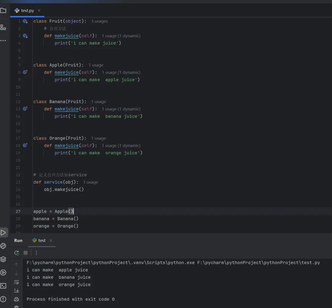 class Fruit(object):# 公共方法def makejuice(self):print('i can make juice')class Apple(Fruit):def makejuice(self):print('i can make apple juice')class Banana(Fruit):def makejuice(self):print('i can make banana juice')class Orange(Fruit):def makejuice(self):print('i can make orange juice')# 定义公共方法如servicedef service(obj):obj.makejuice()apple = Apple()banana = Banana()orange = Orange()for i in (apple, banana, orange):service(i)