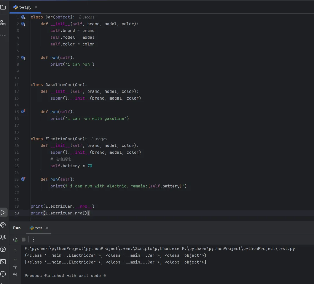 class Car(object):def __init__(self, brand, model, color):self.brand = brandself.model = modelself.color = colordef run(self):print('i can run')class GasolineCar(Car):def __init__(self, brand, model, color):super().__init__(brand, model, color)def run(self):print('i can run with gasoline')class ElectricCar(Car):def __init__(self, brand, model, color):super().__init__(brand, model, color)# 电池属性self.battery = 70def run(self):print(f'i can run with electric,remain:{self.battery}')print(ElectricCar.__mro__)print(ElectricCar.mro())