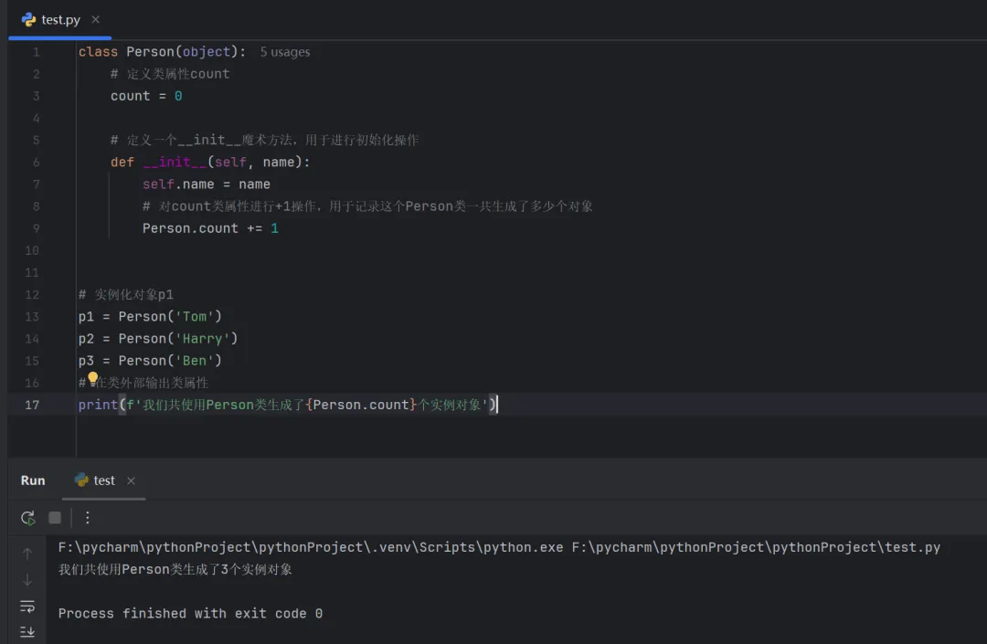 class Person(object):# 定义类属性countcount = 0# 定义一个__init__魔术方法,用于进行初始化操作def __init__(self, name):self.name = name# 对count类属性进行+1操作,用于记录这个Person类一共生成了多少个对象Person.count += 1# 实例化对象p1p1 = Person('Tom')p2 = Person('Harry')p3 = Person('Ben')# 在类外部输出类属性print(f'我们共使用Person类生成了{Person.count}个实例对象')