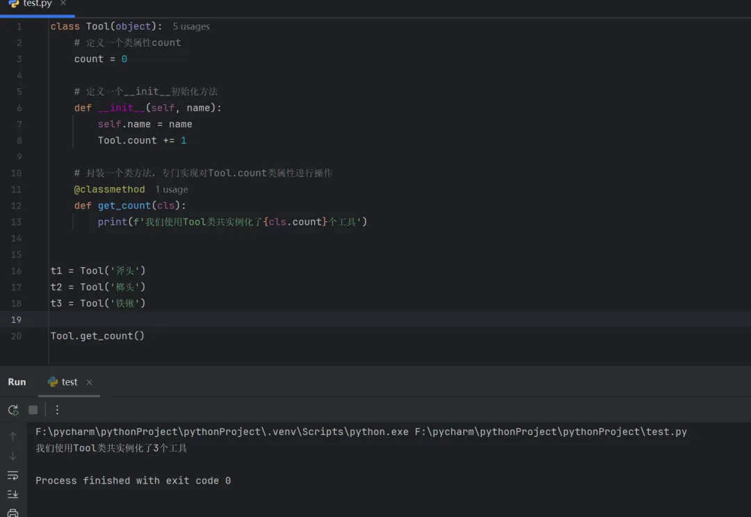 class Tool(object):# 定义一个类属性countcount = 0# 定义一个__init__初始化方法def __init__(self, name):self.name = nameTool.count += 1# 封装一个类方法,专门实现对Tool.count类属性进行操作@classmethoddef get_count(cls):print(f'我们使用Tool类共实例化了{cls.count}个工具')t1 = Tool('斧头')t2 = Tool('榔头')t3 = Tool('铁锹')Tool.get_count()