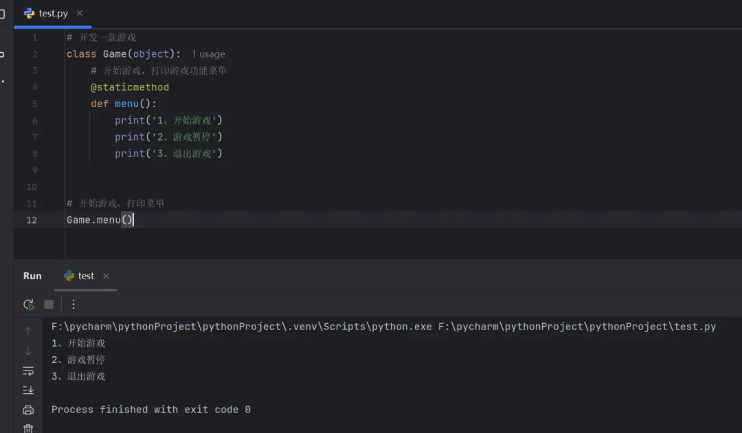 # 开发一款游戏class Game(object):# 开始游戏,打印游戏功能菜单@staticmethoddef menu():print('1、开始游戏')print('2、游戏暂停')print('3、退出游戏')# 开始游戏、打印菜单Game.menu()
