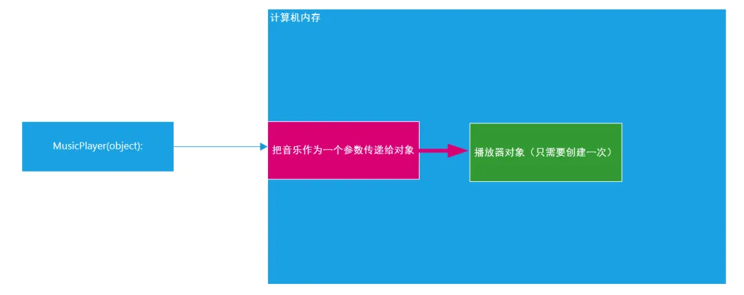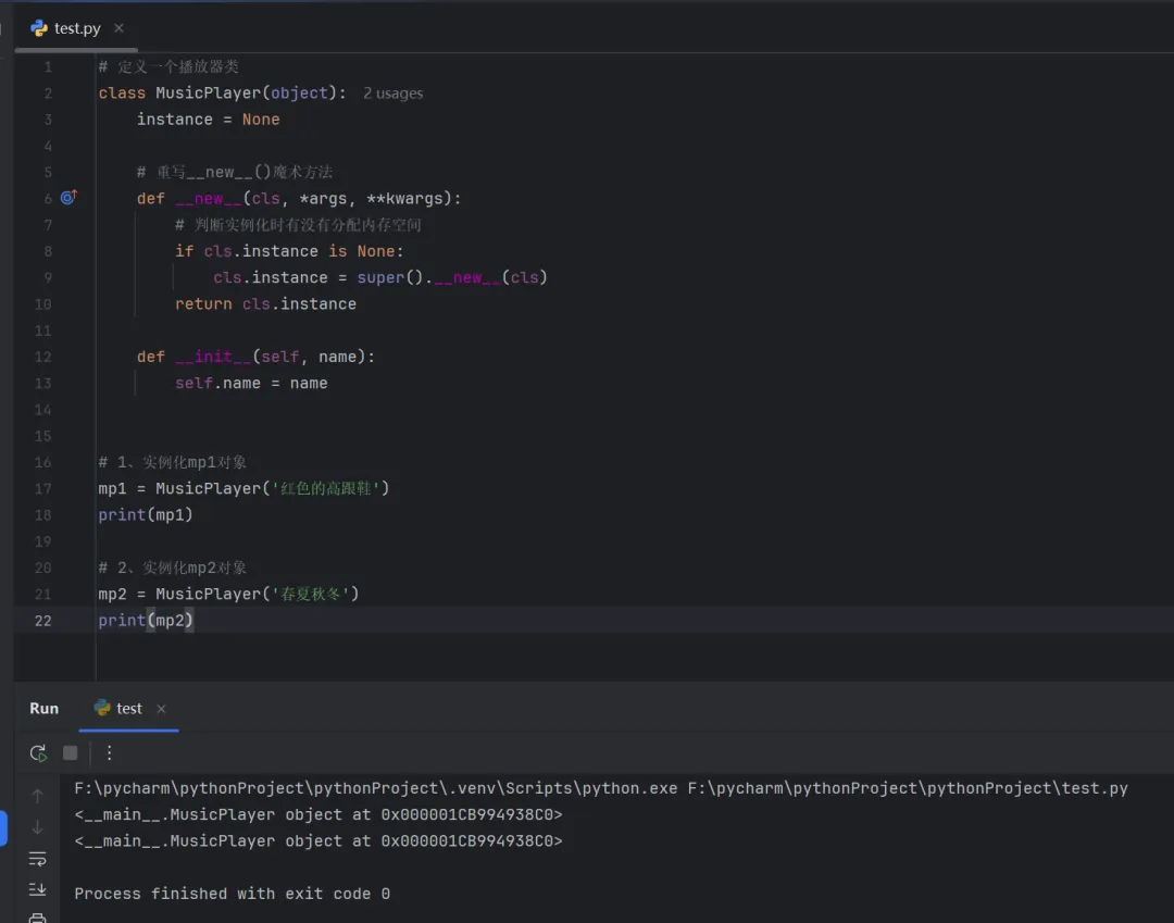 # 定义一个播放器类class MusicPlayer(object):instance = None# 重写__new__()魔术方法def __new__(cls, *args, **kwargs):# 判断实例化时有没有分配内存空间if cls.instance is None:cls.instance = super().__new__(cls)return cls.instancedef __init__(self, name):self.name = name# 1、实例化mp1对象mp1 = MusicPlayer('红色的高跟鞋')print(mp1)# 2、实例化mp2对象mp2 = MusicPlayer('春夏秋冬')print(mp2)