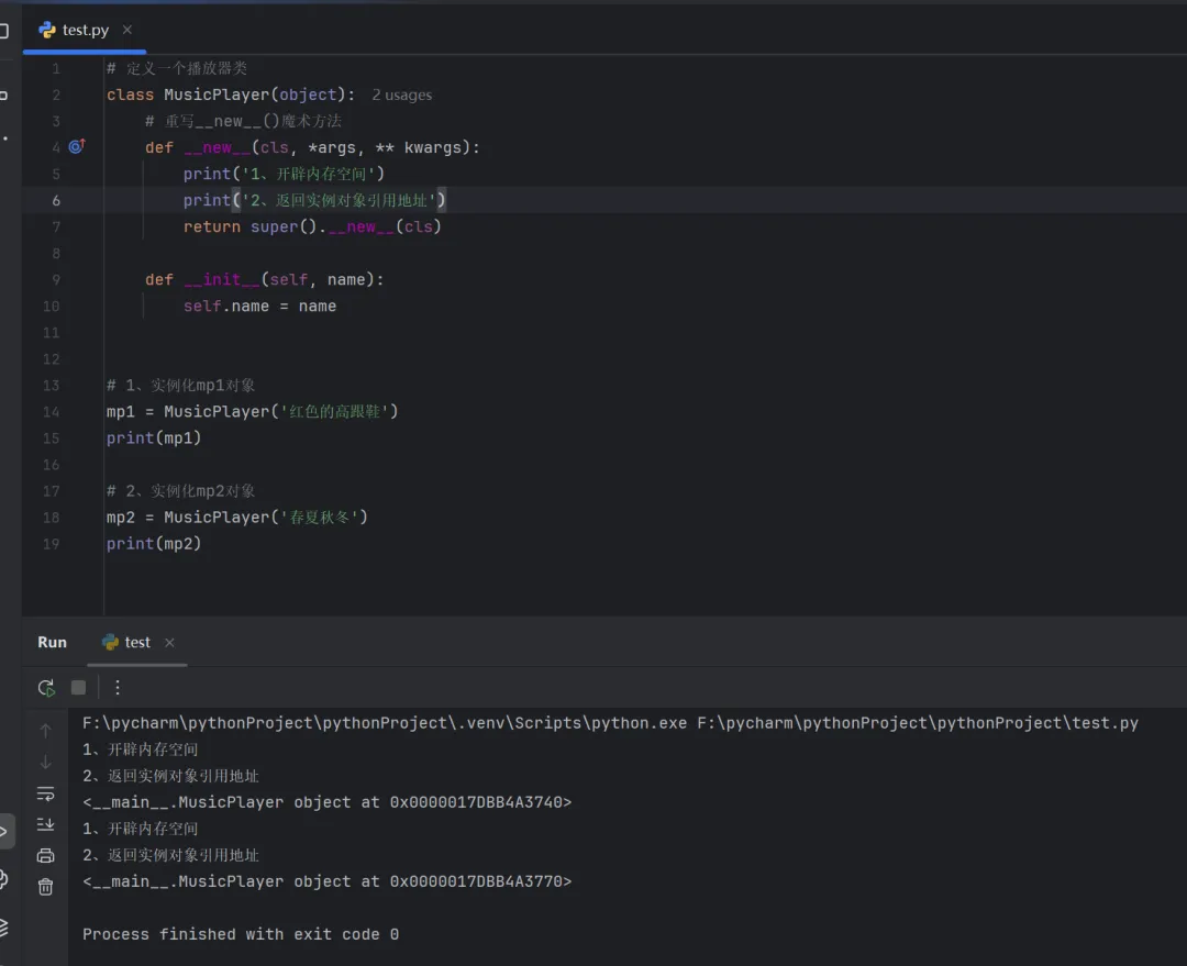 # 定义一个播放器类class MusicPlayer(object):# 重写__new__()魔术方法def __new__(cls, *args,48 **kwargs):print('1、开辟内存空间')print('2、返回实例对象引用地址')returnsuper().__new__(cls)def __init__(self, name):self.name = name# 1、实例化mp1对象mp1 = MusicPlayer('红色的高跟鞋')print(mp1)# 2、实例化mp2对象mp2 = MusicPlayer('春夏秋冬')print(mp2)