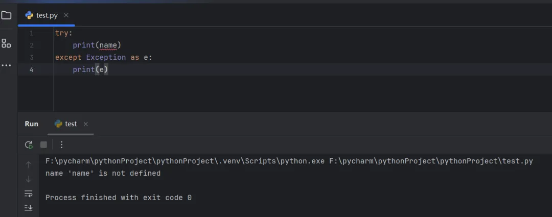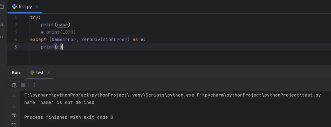 在以上案例代码中,except相当于捕获了所有异常,无论遇到什么错误都会自动执行except中封装的代码。但是有些情况下,我们向针对性的捕获异常,并执行相应的代码。