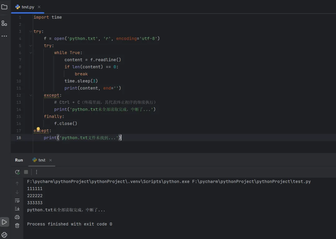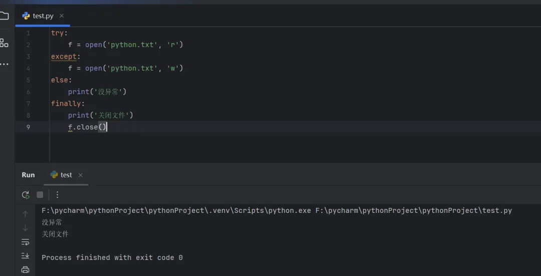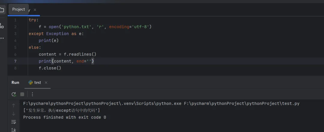 try:f = open('python.txt', 'r')content = f.readline()print(content, end='')except:f = open('python.txt', 'w', encoding='utf-8')f.write('发生异常,执行except语句中的代码')f.close()