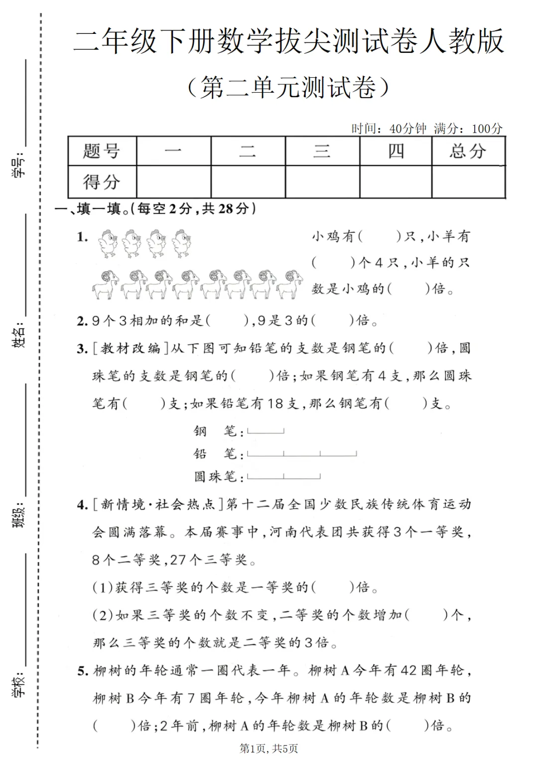 【免费下载】二年级(下)数学 第二单元拔尖测试卷《人教版》,PDF电子版,共5页,可打印